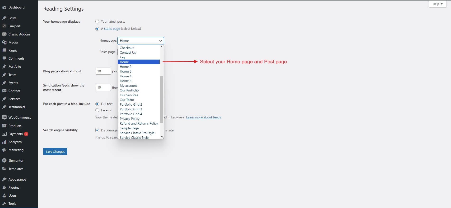 In admin dashboard >> Settings >> Reading >> Reading Settings >> A static page (select below) >> Home Page (Select your home page).