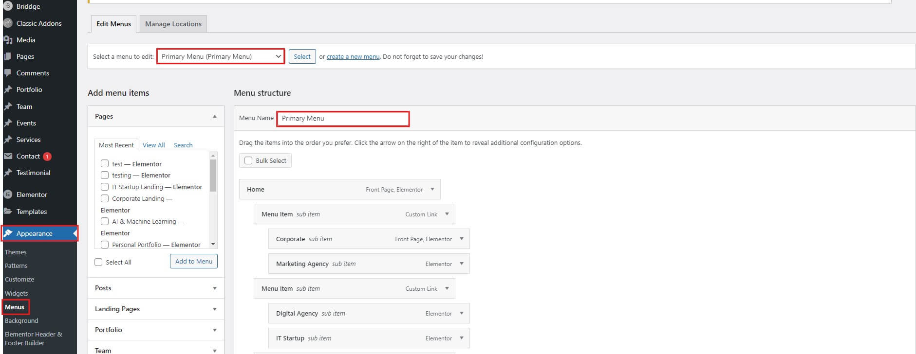Step1: Select a menu to edit: “Primary Menu”.