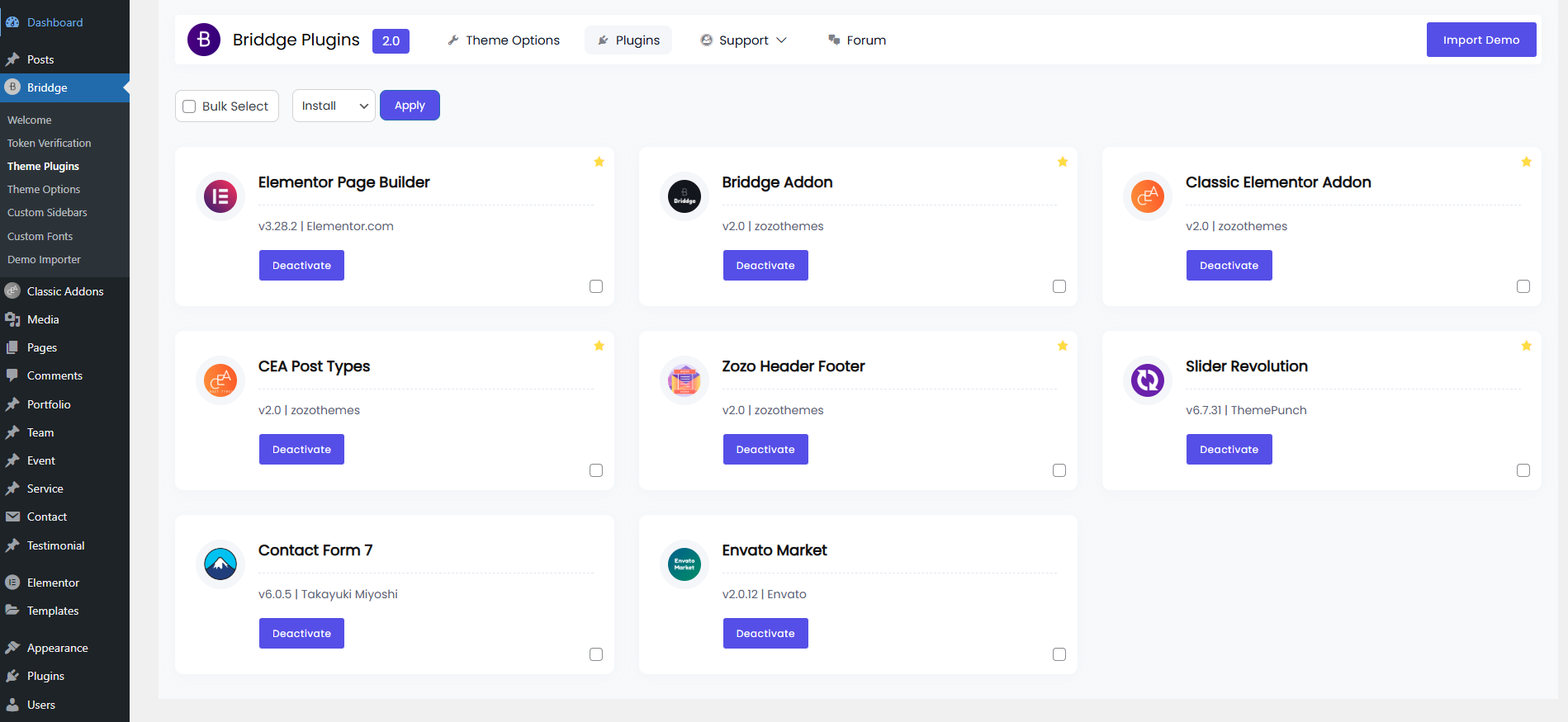 Plugin Installation: Admin Dashboard –>> Briddge –>> Theme Plugins –>> Install and Activate All required plugins.