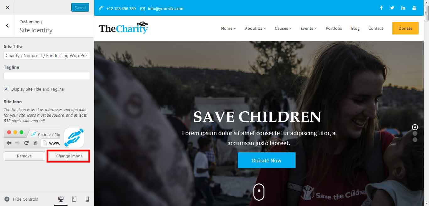 For adding logo to your site, you need to upload your logo as an image file. Once you upload a logo, it will be used in every location. charity allows you to upload a unique logo for 2 different areas; default logo and sticky header logo. Read the below information to upload a logo as well as information on favicons.