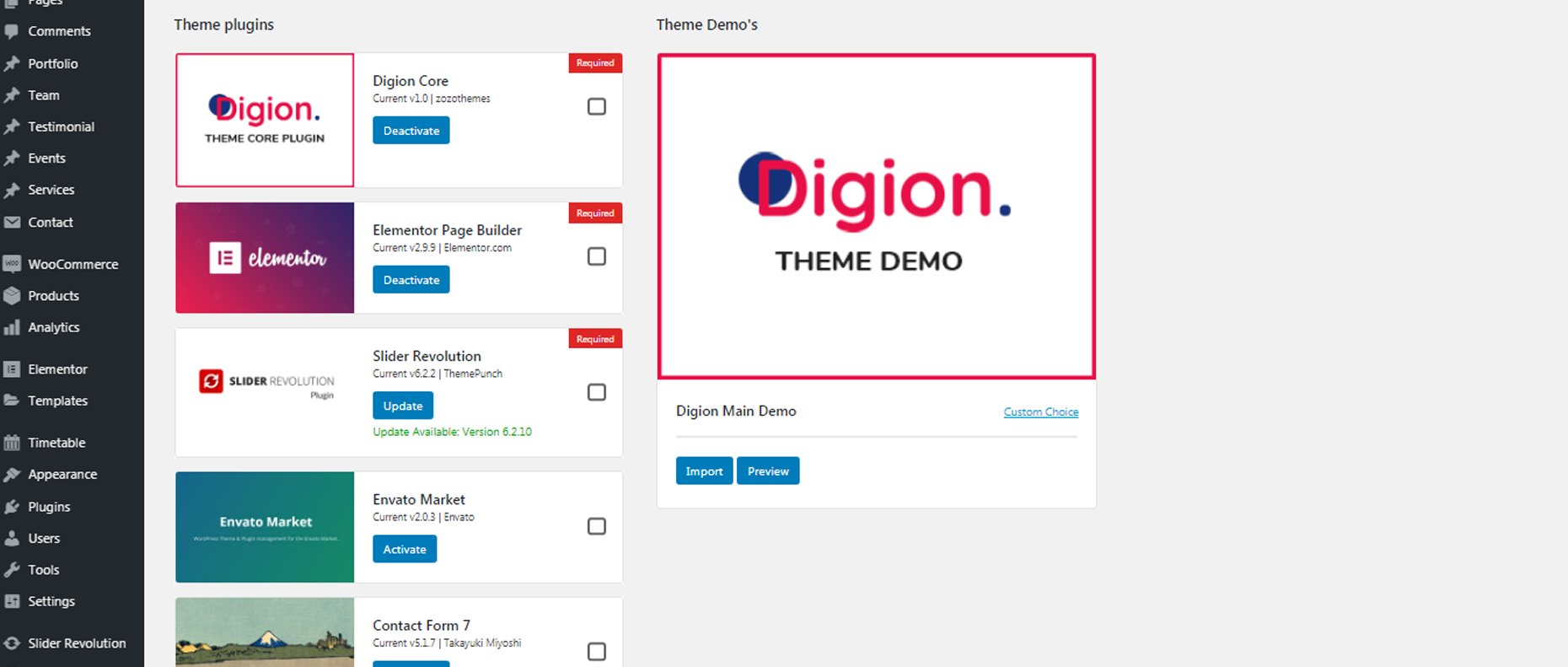 In order to import the demo content go to Theme Panel (WP Dashboard) > Digion > plugin and Demo.