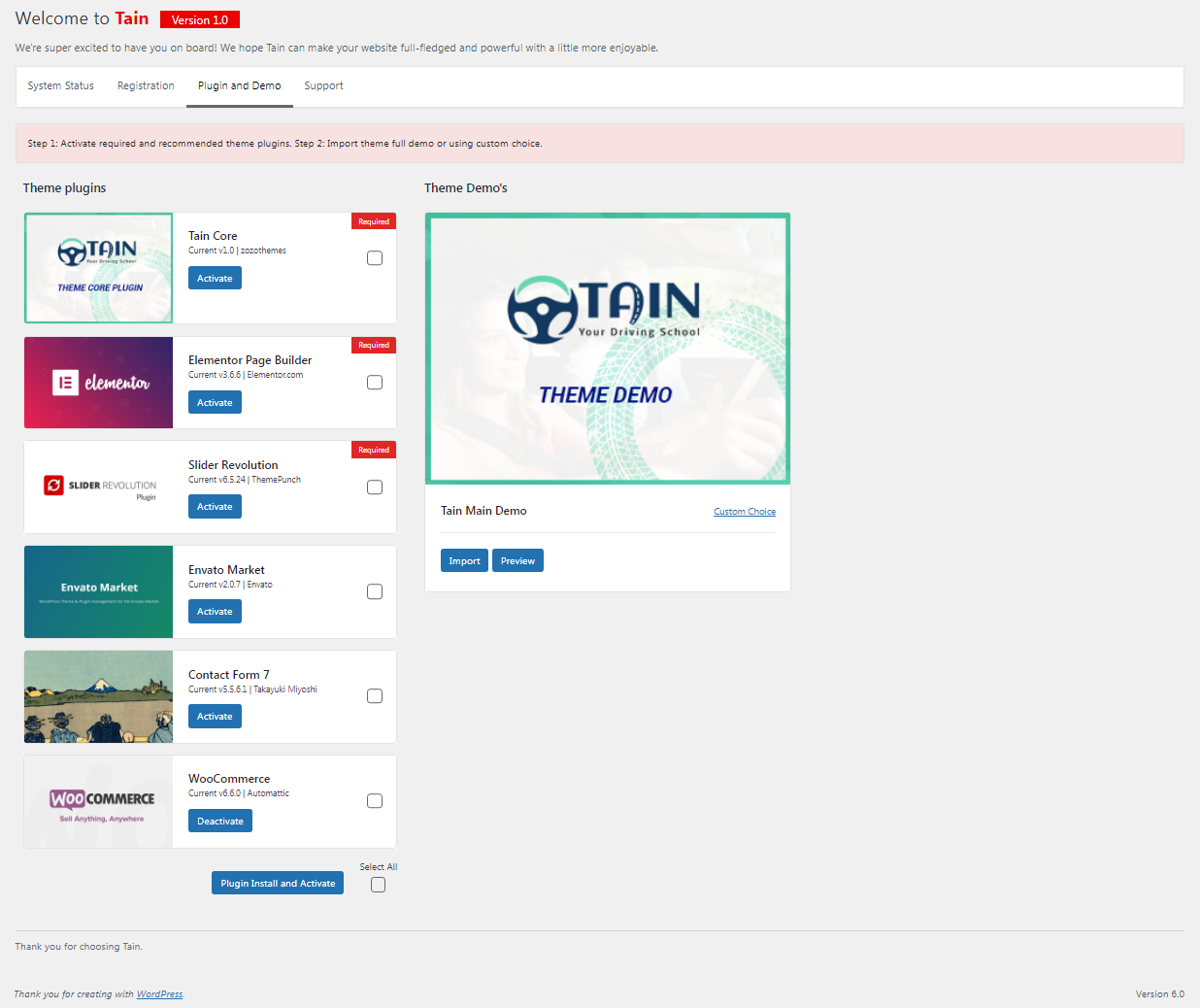 - After the installation/activation of tain Core plug-in and the theme activation you will see plug-ins to install tab. Click on the Click and install plugins link or go to Wordpress Dashboard >> tain >> plugins and demo here you can install all of our recommended plugins.