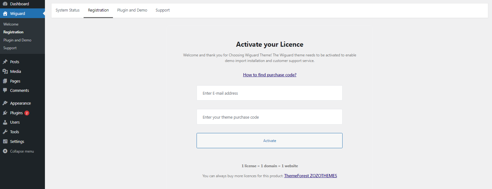 - Enter your theme purchase code in the second field.