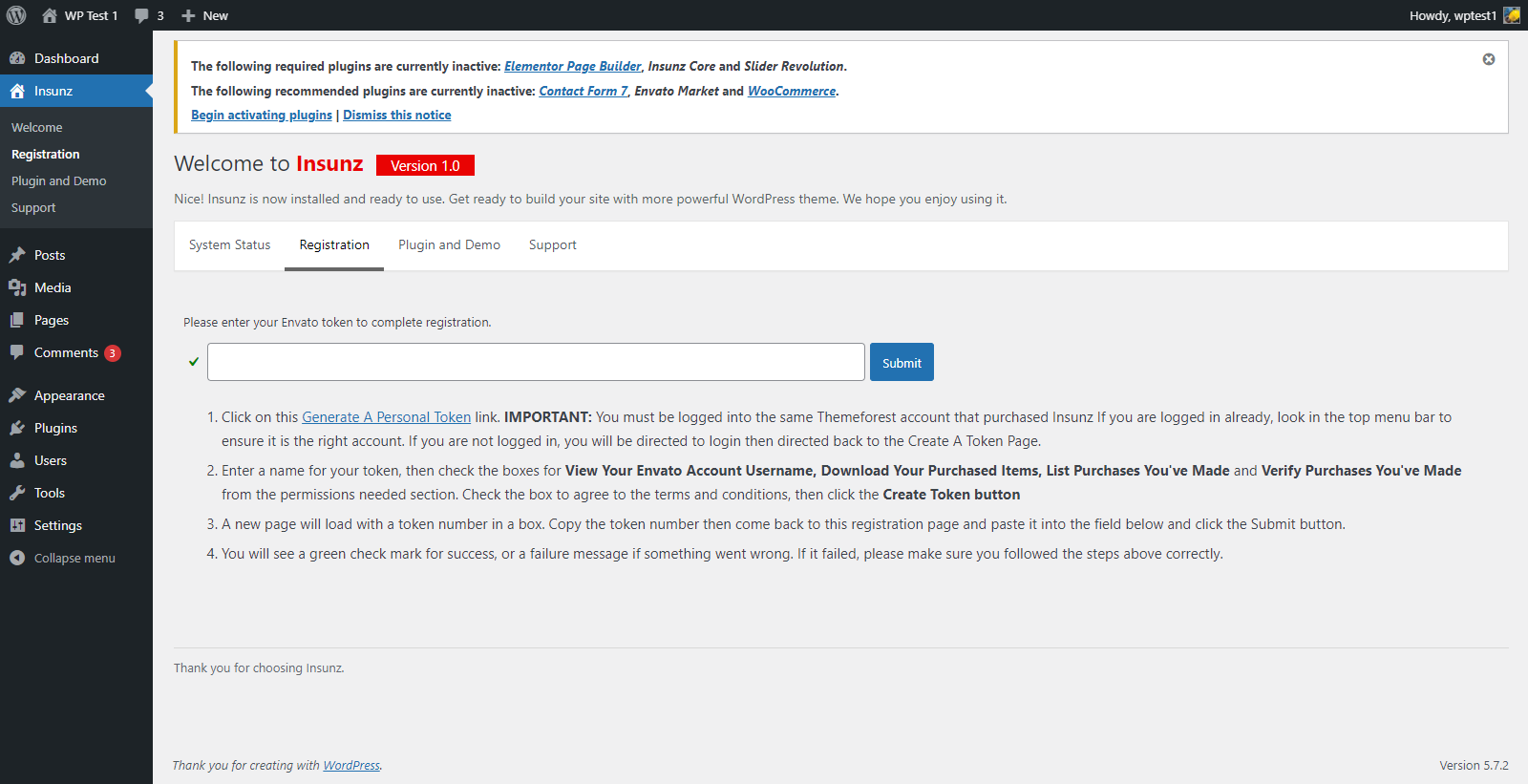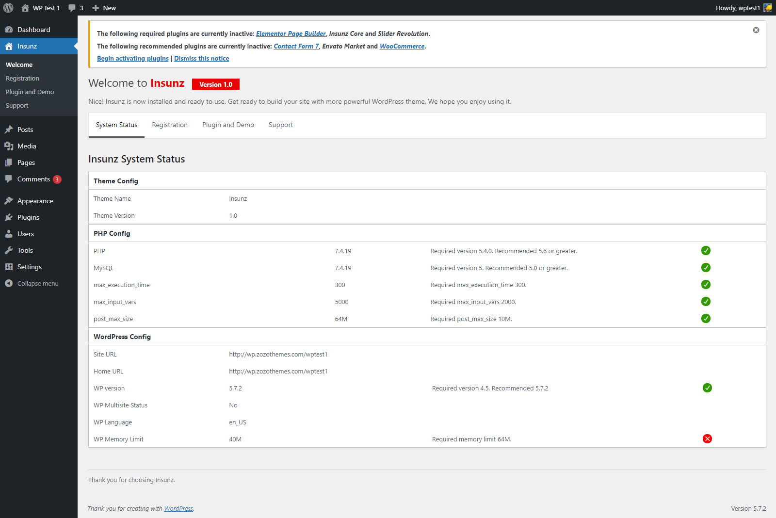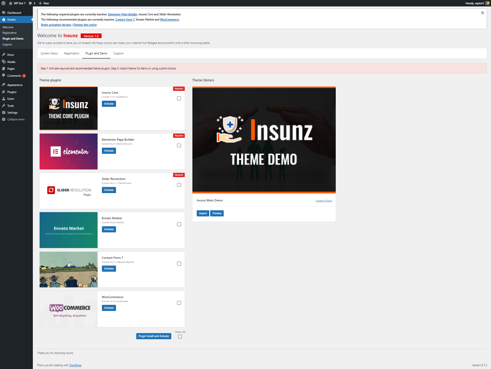 - After the installation/activation of Insunz Core plug-in and the theme activation you will see plug-ins to install tab. Click on the Click and install plugins link or go to Wordpress Dashboard >> Insunz >> plugins and demo here you can install all of our recommended plugins.