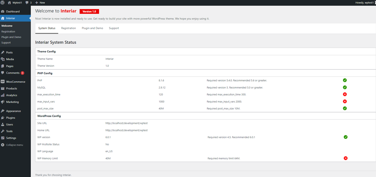 - After the installation/activation of Interiar Core plug-in and the theme activation you will see plug-ins to install tab. Click on the Click and install plugins link or go to Wordpress Dashboard >> Interiar >> plugins and demo here you can install all of our recommended plugins.