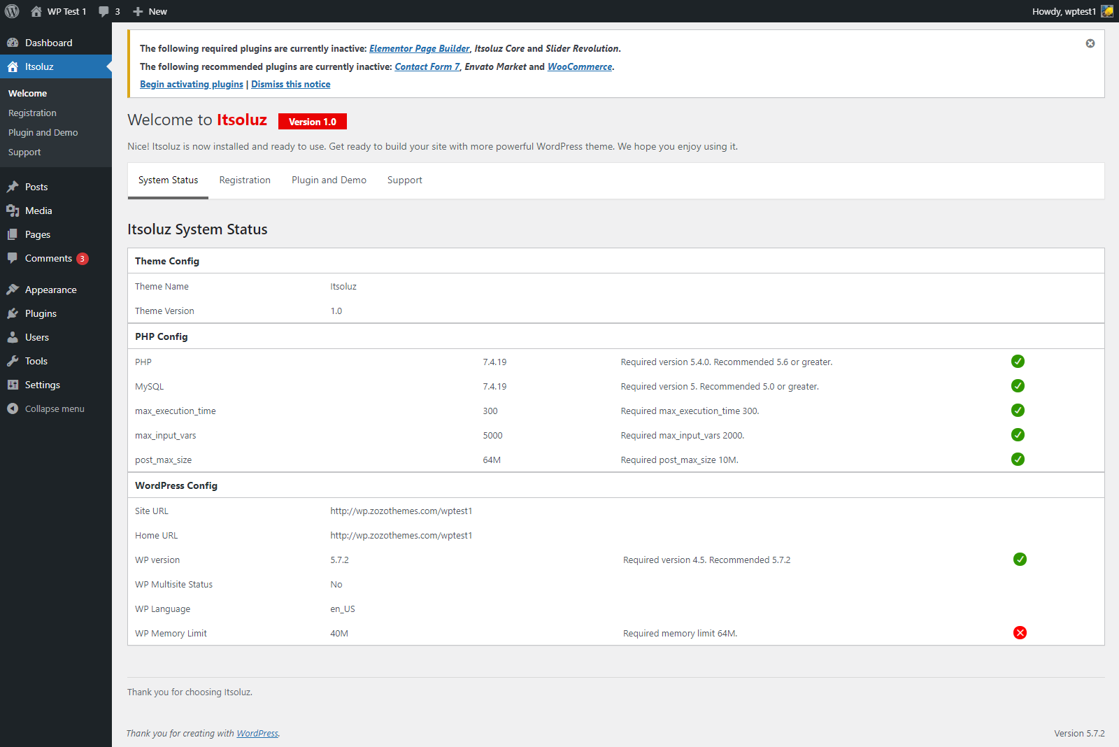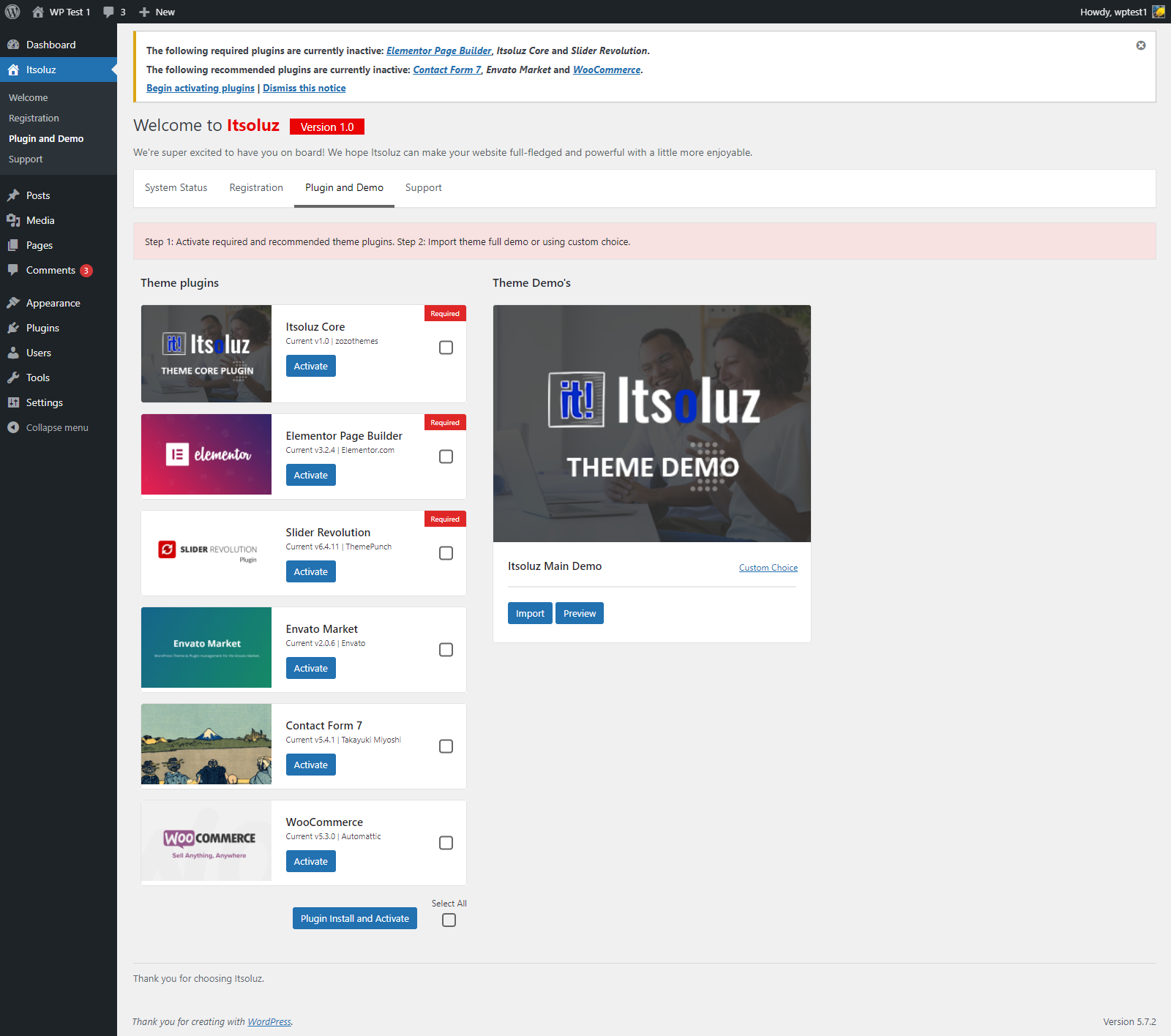 - After the installation/activation of Itsoluz Core plug-in and the theme activation you will see plug-ins to install tab. Click on the Click and install plugins link or go to Wordpress Dashboard >> Itsoluz >> plugins and demo here you can install all of our recommended plugins.