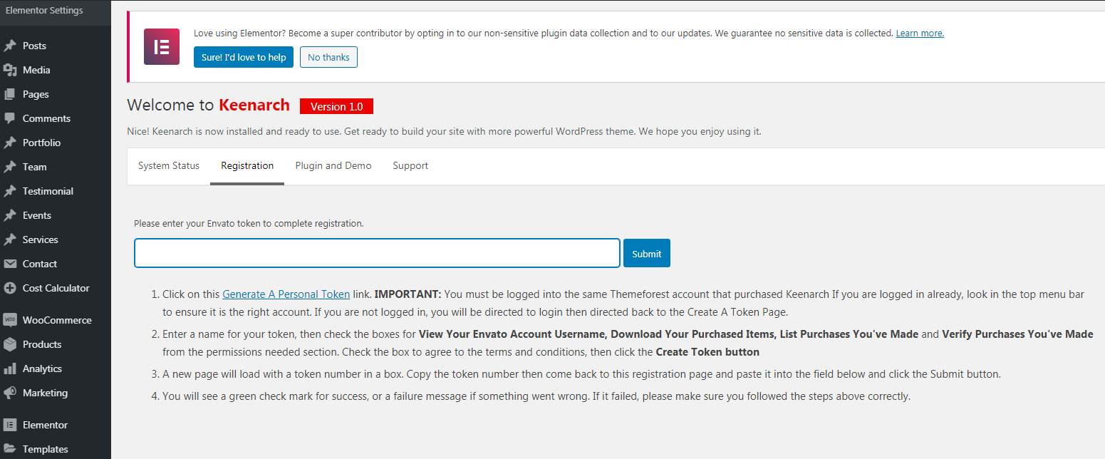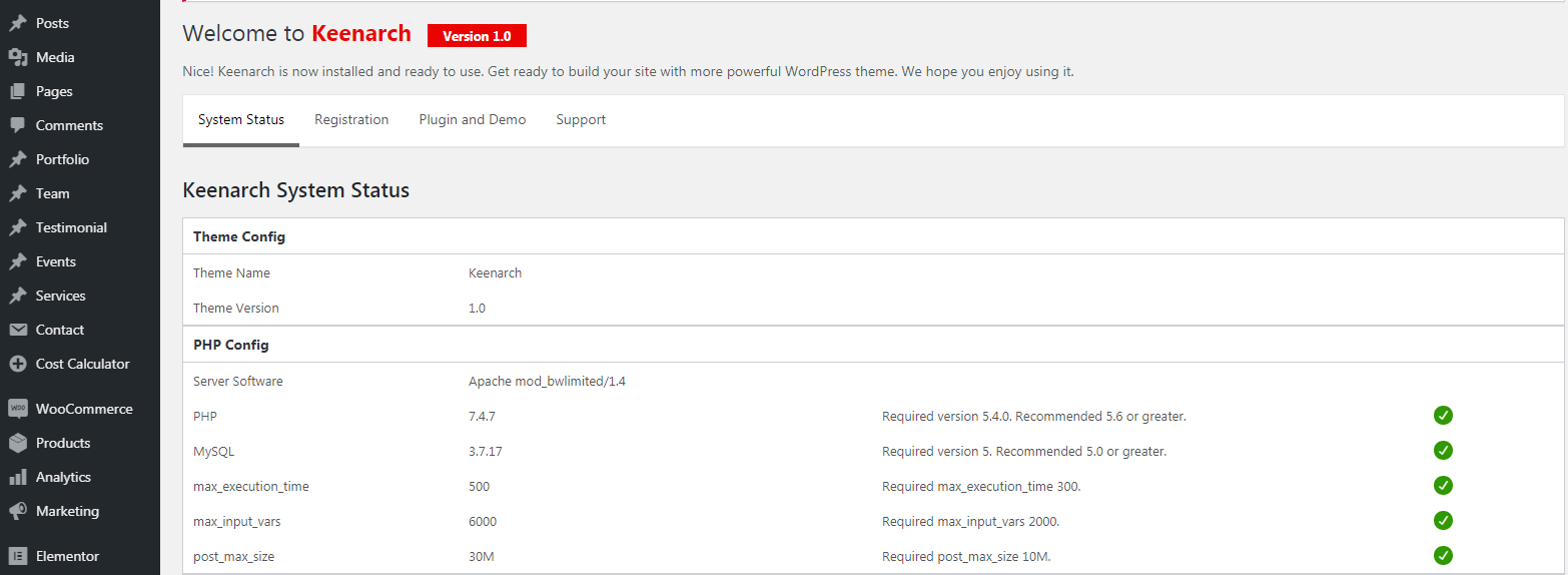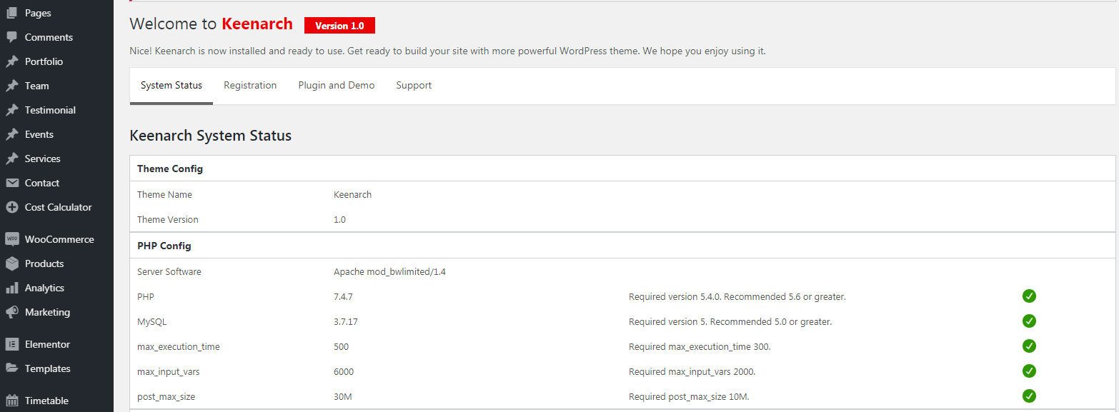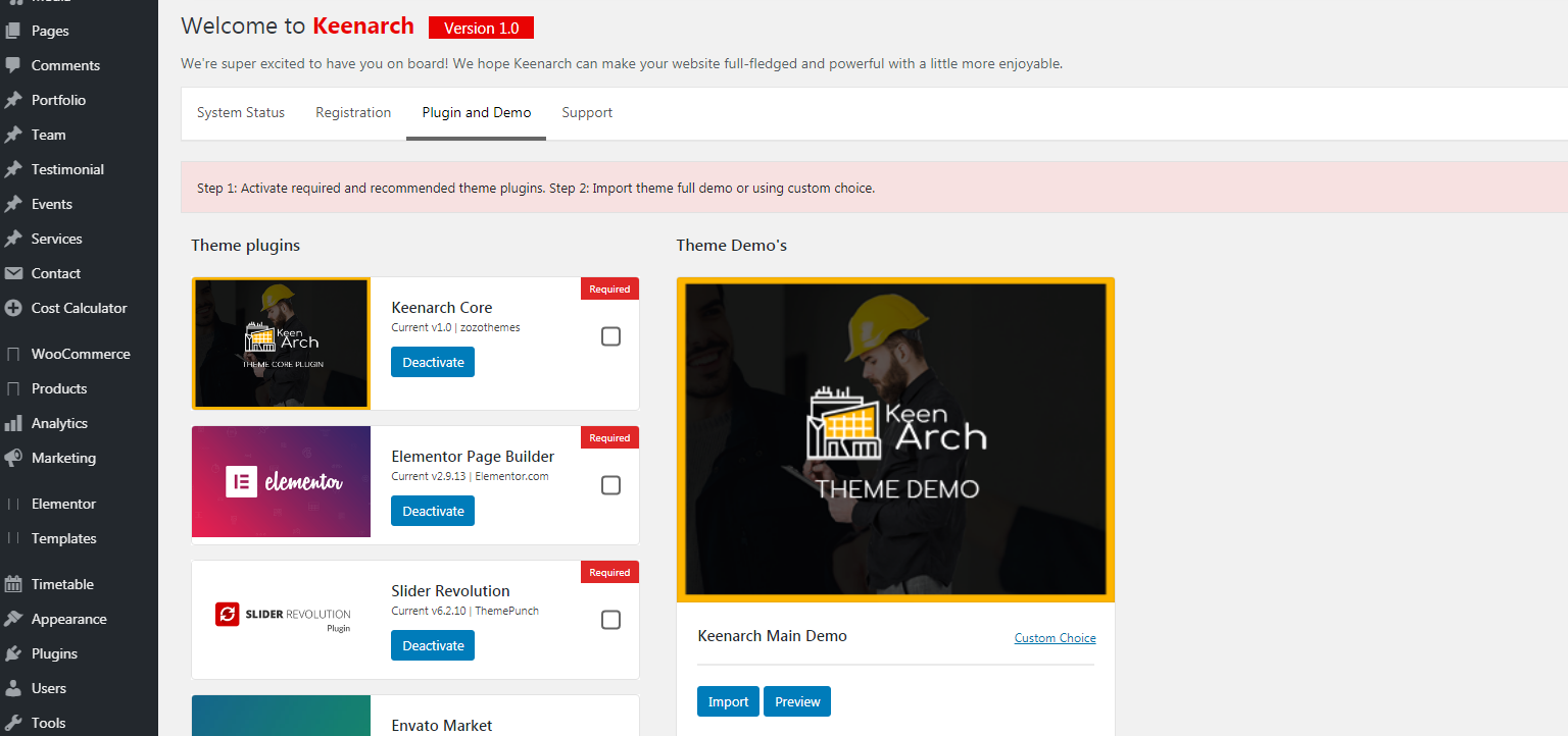 Plugin Installation: Admin Dashboard –>> Keenarch –>> Plugins –>> Install and Activate All required plugins.