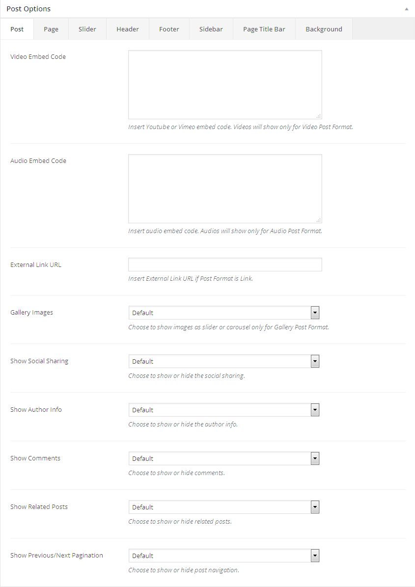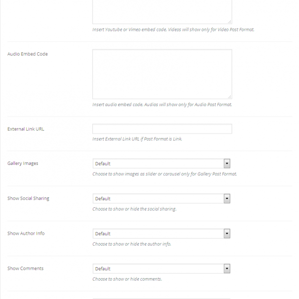 Video Embed Code – Enter video embed code. Videos will show on top of post and also in grid layout only for Video Post Format.