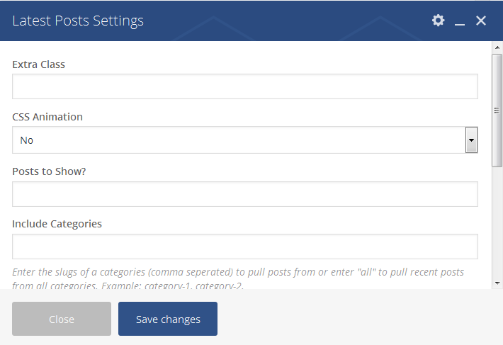 Click on Latest Post Options in Theme Addons tab, The Latest Post Settings Shortcodes window will open.