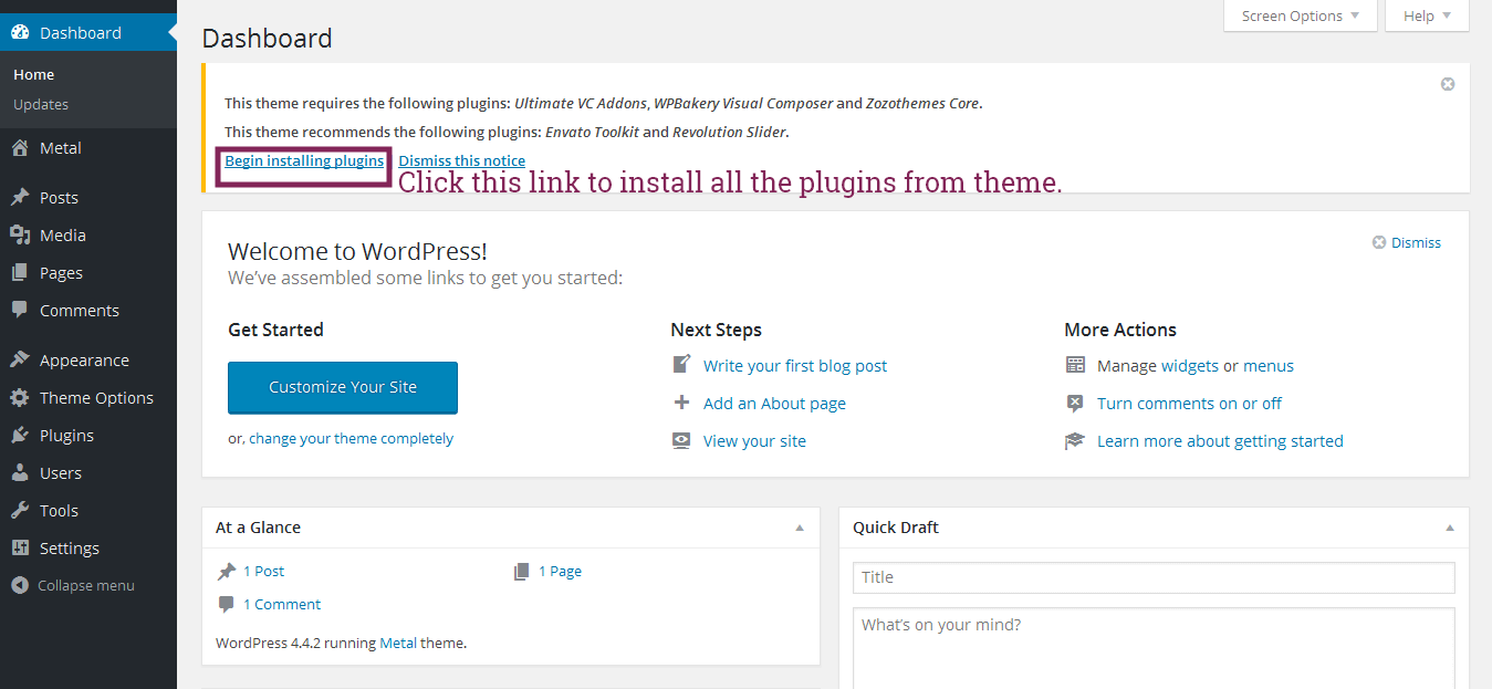 In the notification message, click the Begin installing plugins to install the Plugins given in this theme.