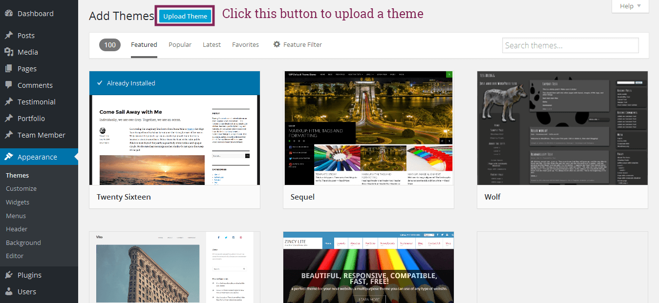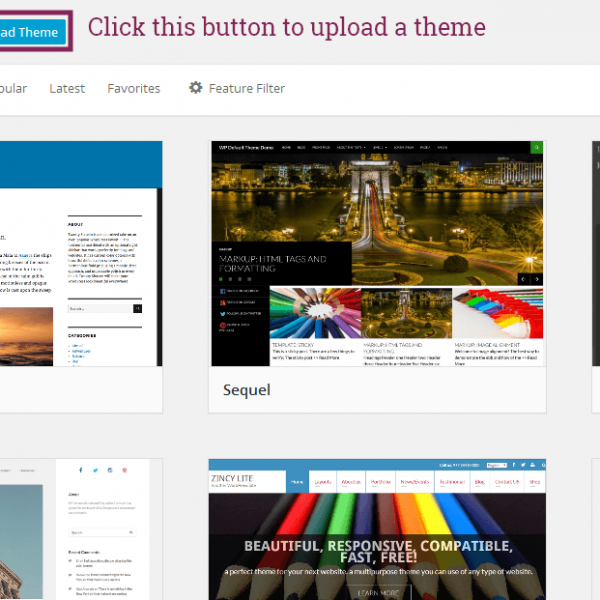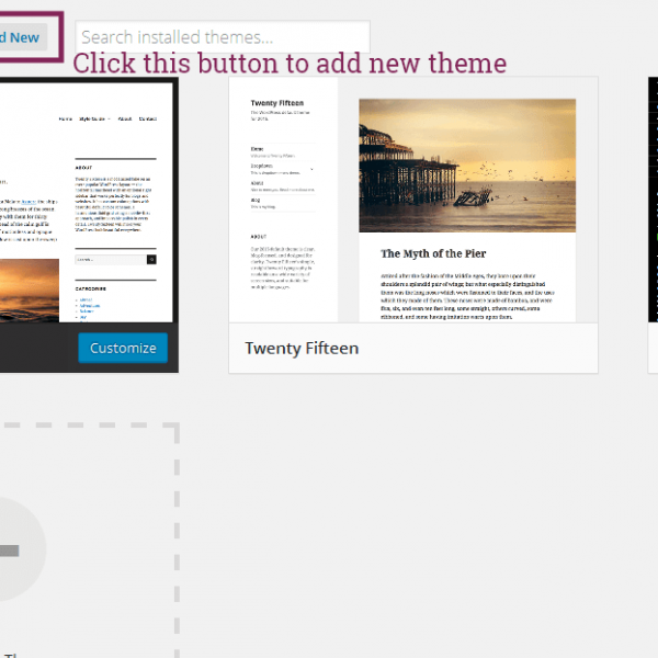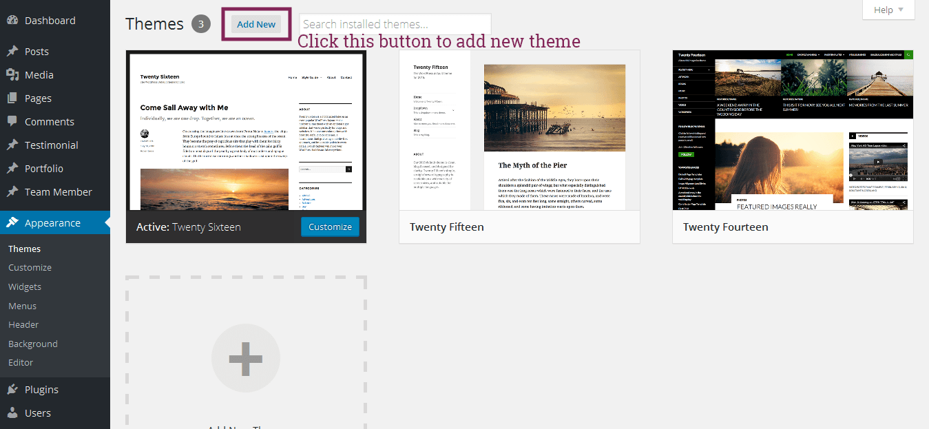 Navigate to Appearance > Themes – Click Add new button, located at the top of the screen or Add new theme.
