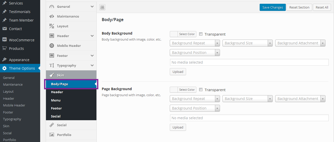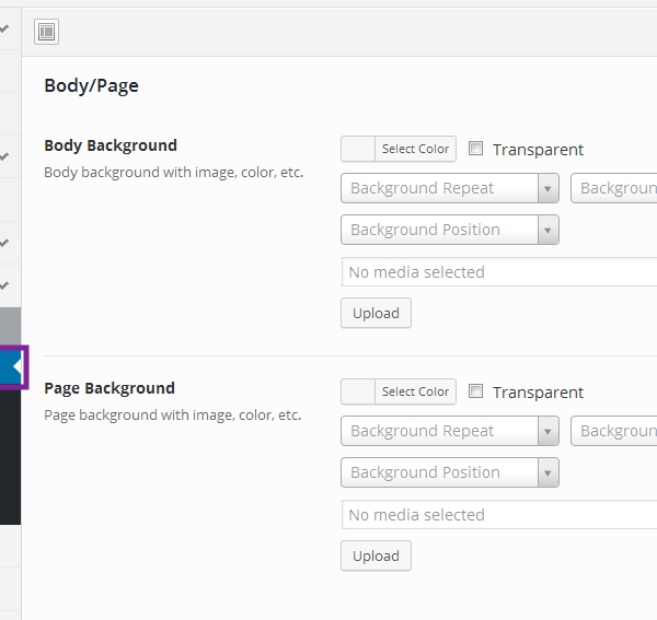 Background – This allows you to choose body, page background options and individually customize the current page’s background.