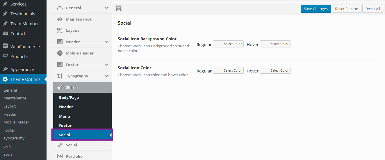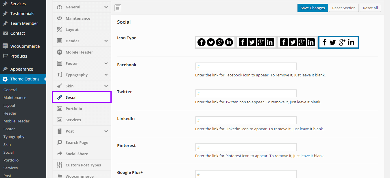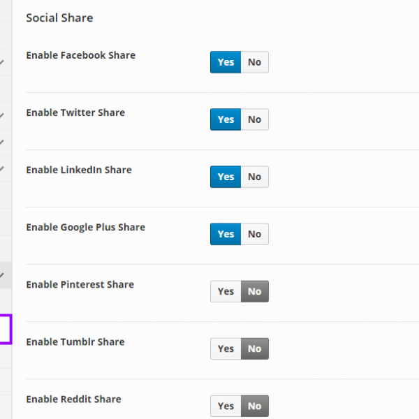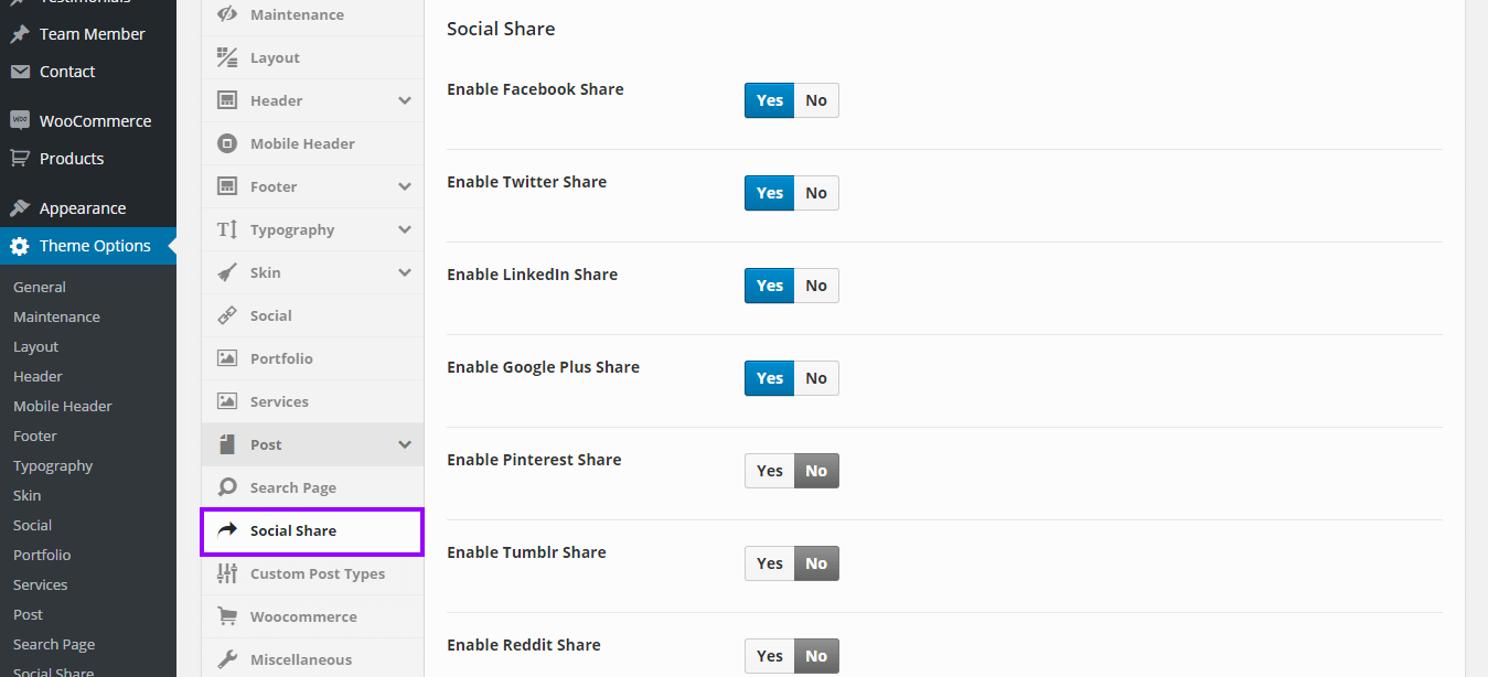 Social Share – These options allow you to enable the social share option in blog post for your theme.