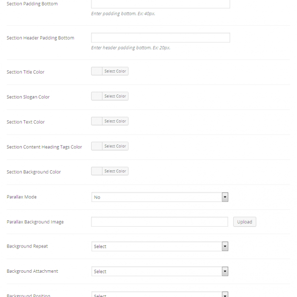 Section Colors – You can choose the colors for following options such as Section Title Color, Section Slogan Color, Section Text Color, Section Content Heading Tags Color, Section Background Color.