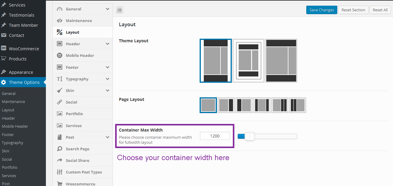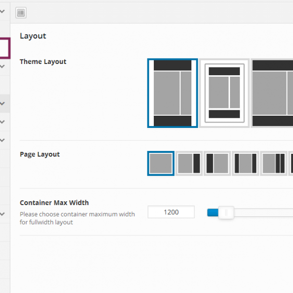Layout – In Layout option, you can choose the theme layout, page layout and select the maximum width for fullwidth and boxed layout.