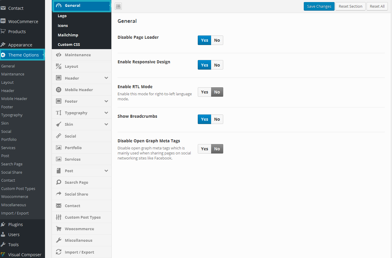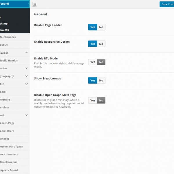 General – In General option, you can enable or disable the Page Loader, you can upload the custom page loader image, select responsive options, enable RTL mode select logo, Disable Open Graph Meta Tags.