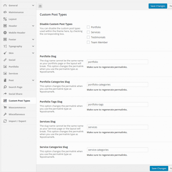 Custom Post Types – These options allow you to enable or disable and customize all the custom post types in the theme.