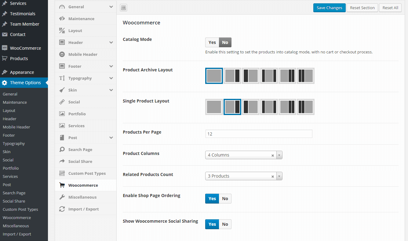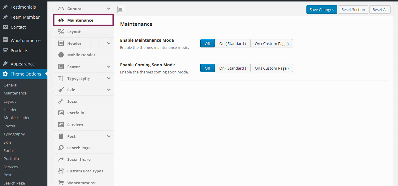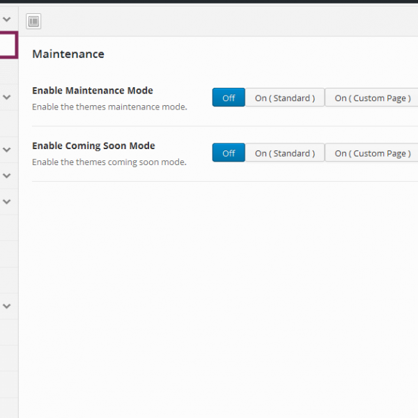 Maintenance – These options allow you enable the themes maintenance mode and coming soon mode.