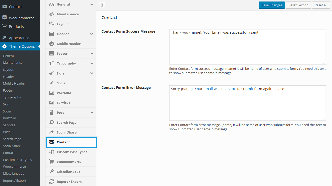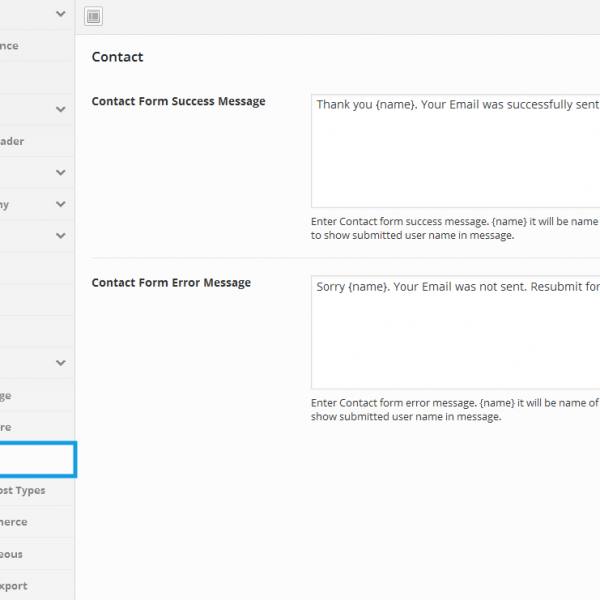 Contact – These options allow you to enter the Contact Form Success & Failure Message.