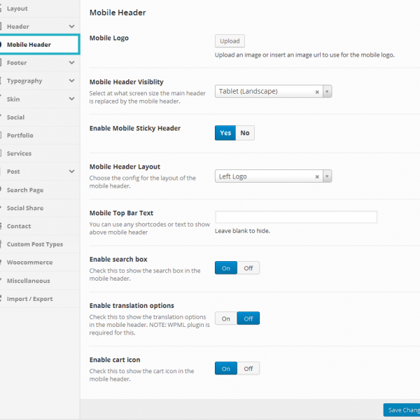 Mobile Header – You can Upload an image or insert an image url to use for the mobile logo and also Enable Mobile Sticky Header.