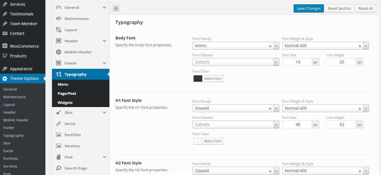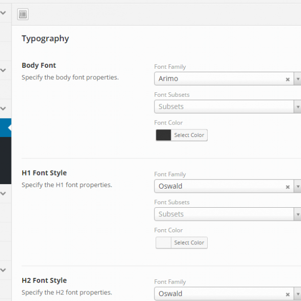 Typography – Typography options allow you to select and customize google fonts for your menu, headings, and posts.