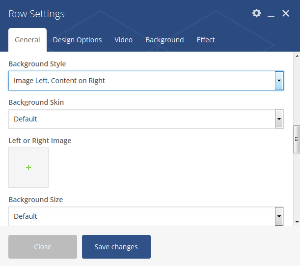 Image Left Content on Right – This options allows you to add the Image on the left side and content on right side. In row settings choose image left, content on right option from the background style options. Choose the image want to show on left side. The image will shows 50% on the left part and you can set the content inside the row shows remaining 50% on right part of the section.