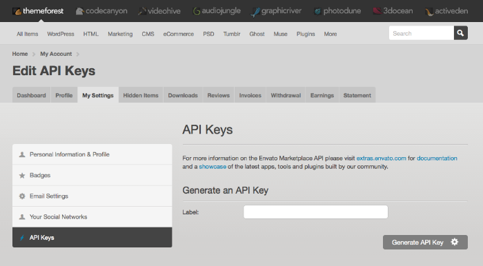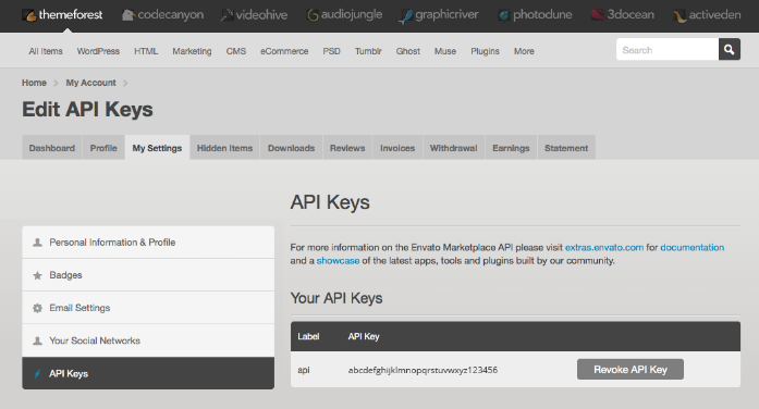 Envato will create a random 32 character API key for you to use. You can create multiple keys if you need to (some users prefer to do this if they are installing each theme purchase on a different domain).