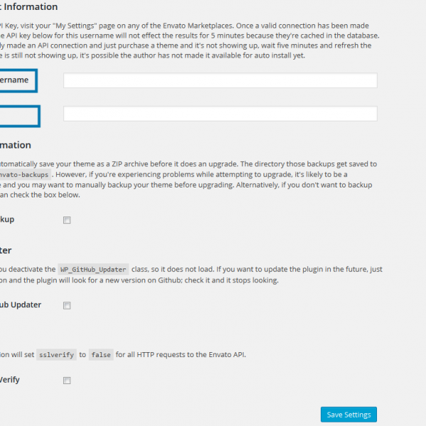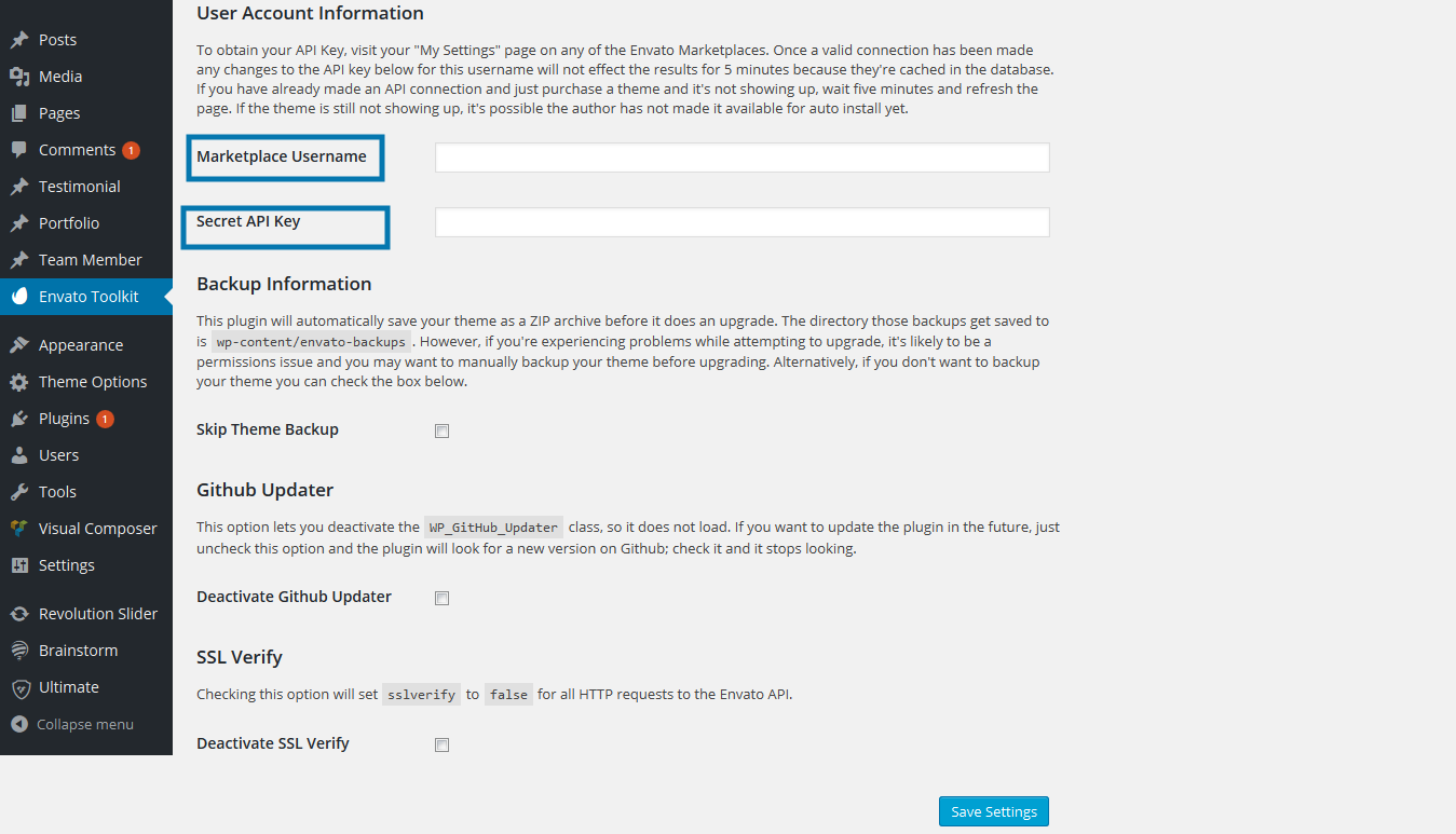 Simply click on the Envato Toolkit menu item in your dashboard and enter in your Envato username and API key. Then Save your settings.