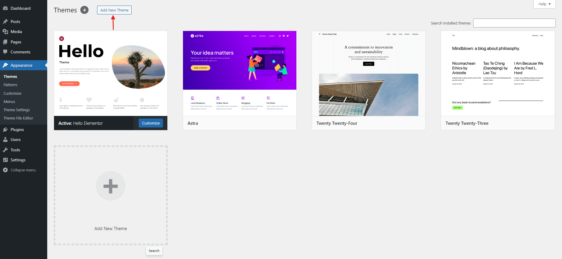 - Navigate to Appearance > Themes. Click the Add New button, located at the top of the screen, or Add New theme