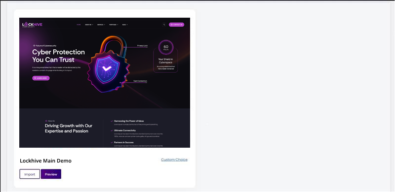 To import the demo go to Theme Panel (WP Dashboard) > Lockhive > Demo Importer.