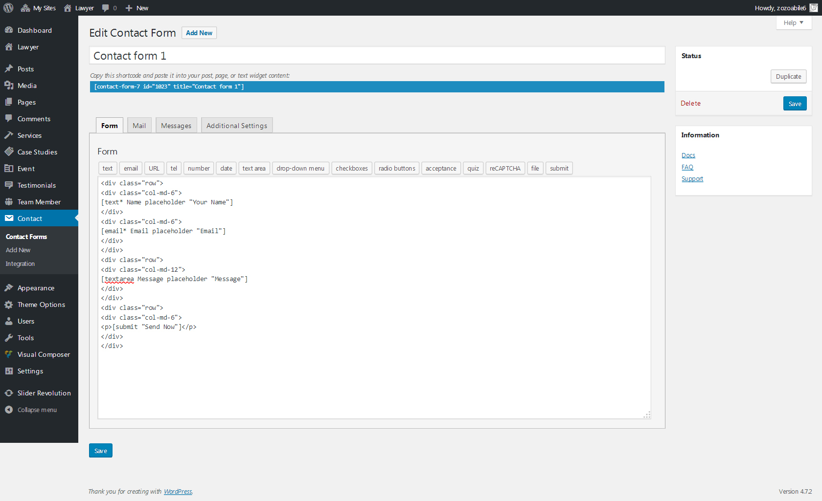 <div class="row"> <div class="col-md-6"> [text Name placeholder "Name"] </div> <div class="col-md-6"> [email* your-email placeholder "Email"] </div> </div> <div class="row"> <div class="col-md-6"> [text* Phone placeholder "Phone"] </div> <div class="col-md-6"> [text your-subject placeholder "Subject"] </div> </div> <div class="row"> <div class="col-md-12"> [textarea your-message placeholder "Message"] </div> </div> [submit "Send Now"]