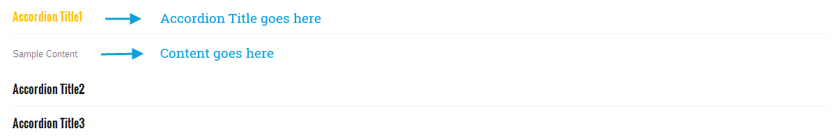 [zozo_accordions style="default"] [zozo_accordion title="Accordion Title1" open="yes"]Sample Content[/zozo_accordion] [zozo_accordion title="Accordion Title2" open="no"]Sample Content[/zozo_accordion] [zozo_accordion title="Accordion Title3" open="no"]Sample Content[/zozo_accordion] [/zozo_accordions]