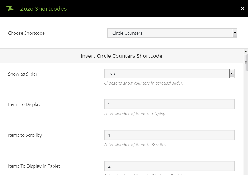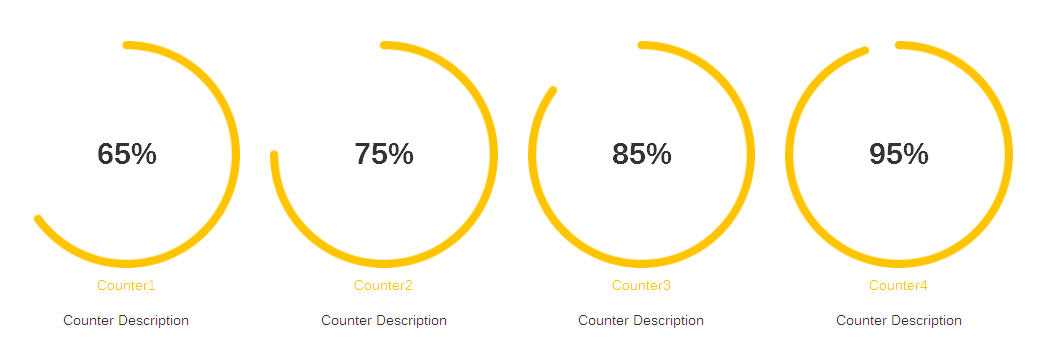 [zozo_circle_counter show_in_slider="no" items="4" itemsscroll="1" itemsdesktopsmall="2" itemstablet="1" itemsmobile="1" navigation="true" pagination="true" autoplay="true" duration="5000" margin="0" column="4" circle_size="220" circle_line_size="8" text_color="#ffc400" desc_color="#333333"] [zozo_circle_counter_item value="65" bar_color="#ffc400" title="Counter1" description="Sample Description" extra_class="" animation_type="none" animation_delay="500"] [zozo_circle_counter_item value="75" bar_color="#ffc400" title="Counter2" description="Sample Description" extra_class="" animation_type="none" animation_delay="500"] [zozo_circle_counter_item value="85" bar_color="#ffc400" title="Counter3" description="Counter Description" extra_class="" animation_type="none" animation_delay="500"] [zozo_circle_counter_item value="95" bar_color="#ffc400" title="Counter4" description="Sample Description" extra_class="" animation_type="none" animation_delay="500"] [/zozo_circle_counter]