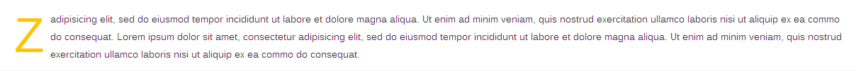 [zozo_dropcap color="#ffc400"]Z[/zozo_dropcap]adipisicing elit, sed do eiusmod tempor incididunt ut labore et dolore magna aliqua. Ut enim ad minim veniam, quis nostrud exercitation ullamco laboris nisi ut aliquip ex ea commo do consequat. Lorem ipsum dolor sit amet, consectetur adipisicing elit, sed do eiusmod tempor incididunt ut labore et dolore magna aliqua. Ut enim ad minim veniam, quis nostrud exercitation ullamco laboris nisi ut aliquip ex ea commo do consequat.