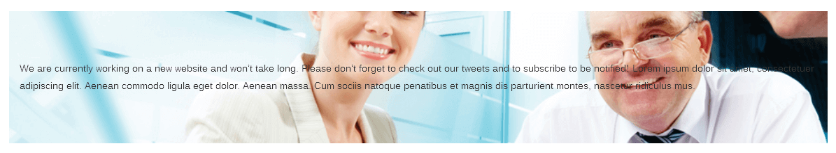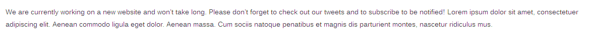 [zozo_leadpara align="center"]We are currently working on a new website and won’t take long. Please don’t forget to check out our tweets and to subscribe to be notified! Lorem ipsum dolor sit amet, consectetuer adipiscing elit. Aenean commodo ligula eget dolor. Aenean massa. Cum sociis natoque penatibus et magnis dis parturient montes, nascetur ridiculus mus.[/zozo_leadpara]
