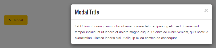 [zozo_modals title="Modal Title" modal_size="default" button_size="default" button_text="Modal" button_bg_color="#ffc400" button_bg_hover_color="" color="#333333" hovercolor="" icon="fa fa-tint" icon_pos="left" animation_type="none" animation_delay="500"]1st Column Lorem ipsum dolor sit amet, consectetur adipisicing elit, sed do eiusmod tempor incididunt ut labore et dolore magna aliqua. Ut enim ad minim veniam, quis nostrud exercitation ullamco laboris nisi ut aliquip ex ea commo do consequat. [/zozo_modals]