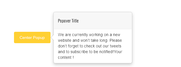 [zozo_popover title="Popover Title" popover_pos="right" link_type="button" show_on="hover" link_text="Center Popup" link_url="#" target="_self" size="default" button_bg_color="#ffc400" button_bg_hover_color="" color="#333333" hovercolor="" icon="fa fa-expand" icon_pos="left"]We are currently working on a new website and won’t take long. Please don’t forget to check out our tweets and to subscribe to be notified!Your content ![/zozo_popover]