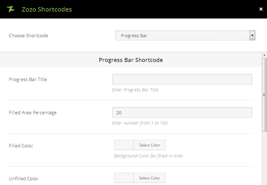 [zozo_progress_bar title="Progress1" percentage="75" filledcolor="#ffc400" unfilledcolor="#6b6b6b" animation="yes"]Html[/zozo_progress_bar][zozo_progress_bar title="Progress2" percentage="85" filledcolor="#ffc400" unfilledcolor="#6b6b6b" animation="yes"]CSS[/zozo_progress_bar][zozo_progress_bar title="Progress3" percentage="95" filledcolor="#ffc400" unfilledcolor="#6b6b6b" animation="yes"]Wordpress[/zozo_progress_bar]