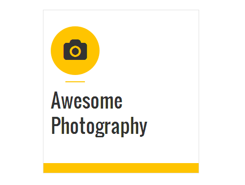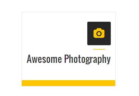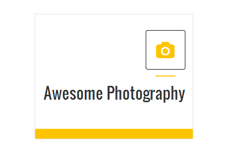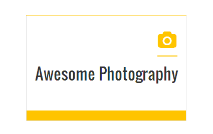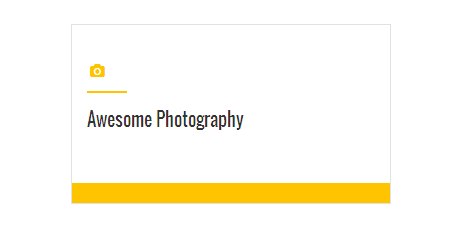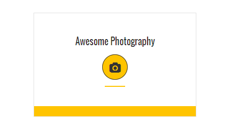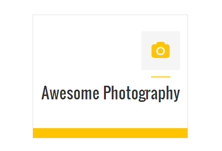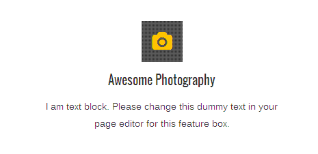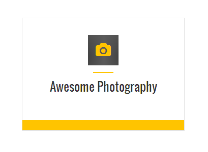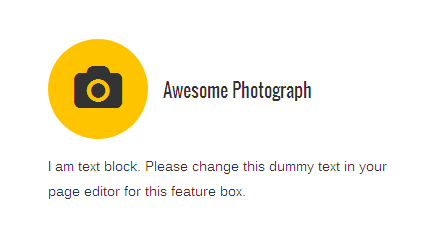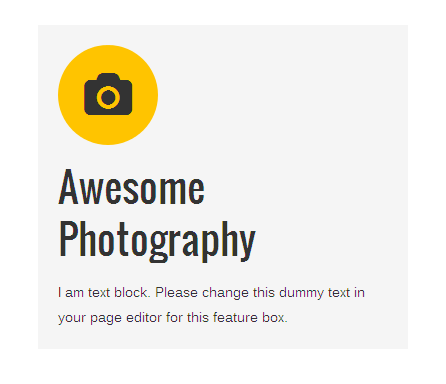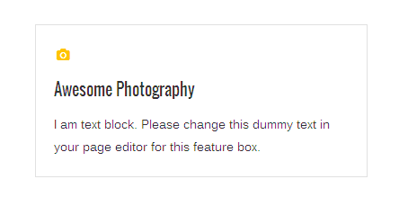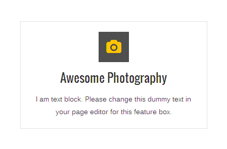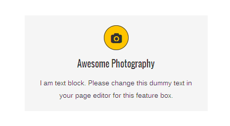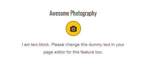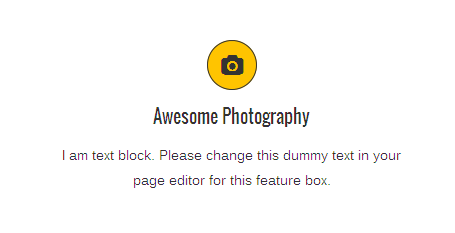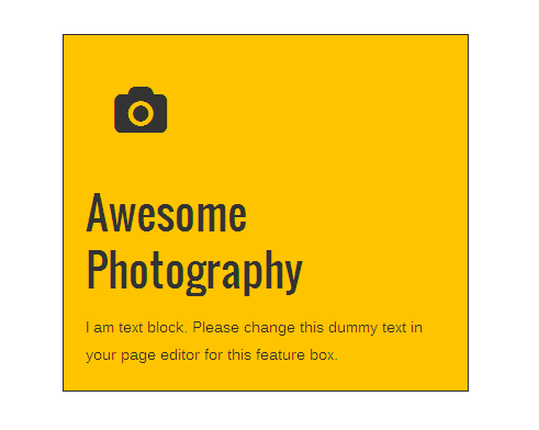 [vc_row][vc_column][zozo_vc_feature_box box_style="outline-box" text_align="left" type="fontawesome" icon_fontawesome="fa fa-camera" icon_size="exlarge" icon_shape="icon-circle" icon_hover_style="icon-hv-all" title="Awesome Photography" bg_color="#ffc400" box_br_color="#2e2e2e"]I am text block. Please change this dummy text in your page editor for this feature box.[/zozo_vc_feature_box][/vc_column][/vc_row]