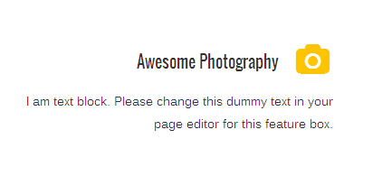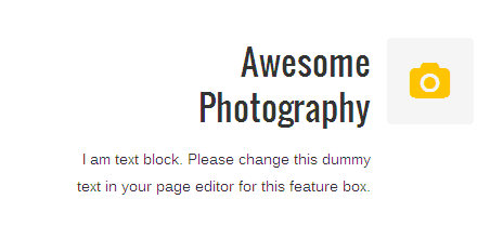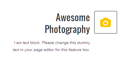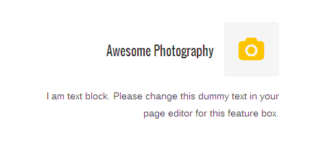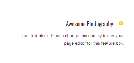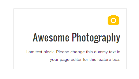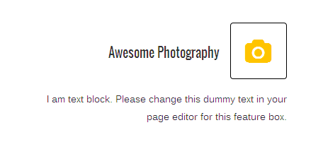 [vc_row][vc_column][zozo_vc_feature_box box_style="title-top-icon" text_align="right" type="fontawesome" icon_fontawesome="fa fa-camera" icon_size="small" icon_hover_style="icon-hv-all" title="Awesome Photography" title_type="h5"]I am text block. Please change this dummy text in your page editor for this feature box.[/zozo_vc_feature_box][/vc_column][/vc_row]
