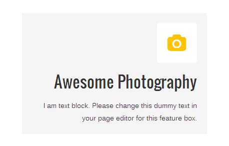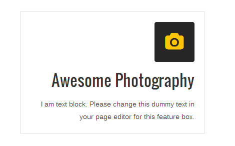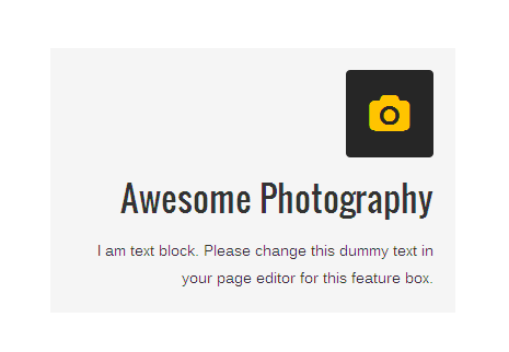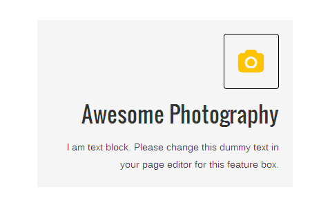 [vc_row][vc_column][zozo_vc_feature_box box_style="box-with-bg" text_align="right" type="fontawesome" icon_fontawesome="fa fa-camera" icon_size="large" icon_shape="icon-rounded" icon_style="icon-dark" icon_hover_style="icon-hv-all" title="Awesome Photography" title_type="h3"]I am text block. Please change this dummy text in your page editor for this feature box.[/zozo_vc_feature_box][/vc_column][/vc_row]