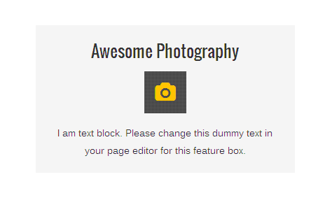 [vc_row][vc_column][zozo_vc_feature_box box_style="overlay-box" text_align="left" type="fontawesome" icon_fontawesome="fa fa-camera" icon_size="small" icon_hover_style="icon-hv-bg-icon" title="Awesome Photography" title_type="h5"]I am text block. Please change this dummy text in your page editor for this feature box.[/zozo_vc_feature_box][/vc_column][/vc_row]
