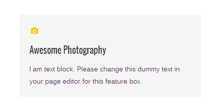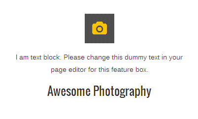 [vc_row][vc_column][zozo_vc_feature_box text_align="left" type="fontawesome" icon_fontawesome="fa fa-camera" icon_size="small" icon_hover_style="icon-hv-all" title="Awesome Photography" title_type="h5"]I am text block. Please change this dummy text in your page editor for this feature box.[/zozo_vc_feature_box][/vc_column][/vc_row]
