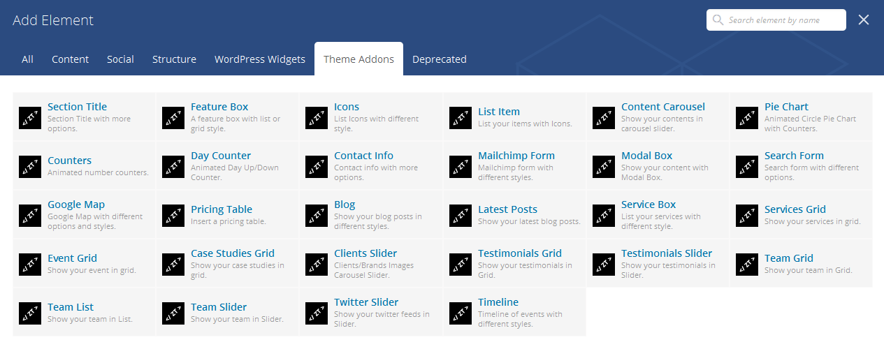 Below showing a complete list of all the shortcodes included in Visual Composer and having customization options for each one. The list of Visual Composer shortcodes are following.