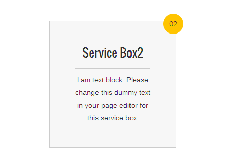 [vc_row][vc_column][zozo_vc_service_box box_style="square" ribbon_text="02" title="Service Box2"]I am text block. Please change this dummy text in your page editor for this service box.[/zozo_vc_service_box][/vc_column][/vc_row]