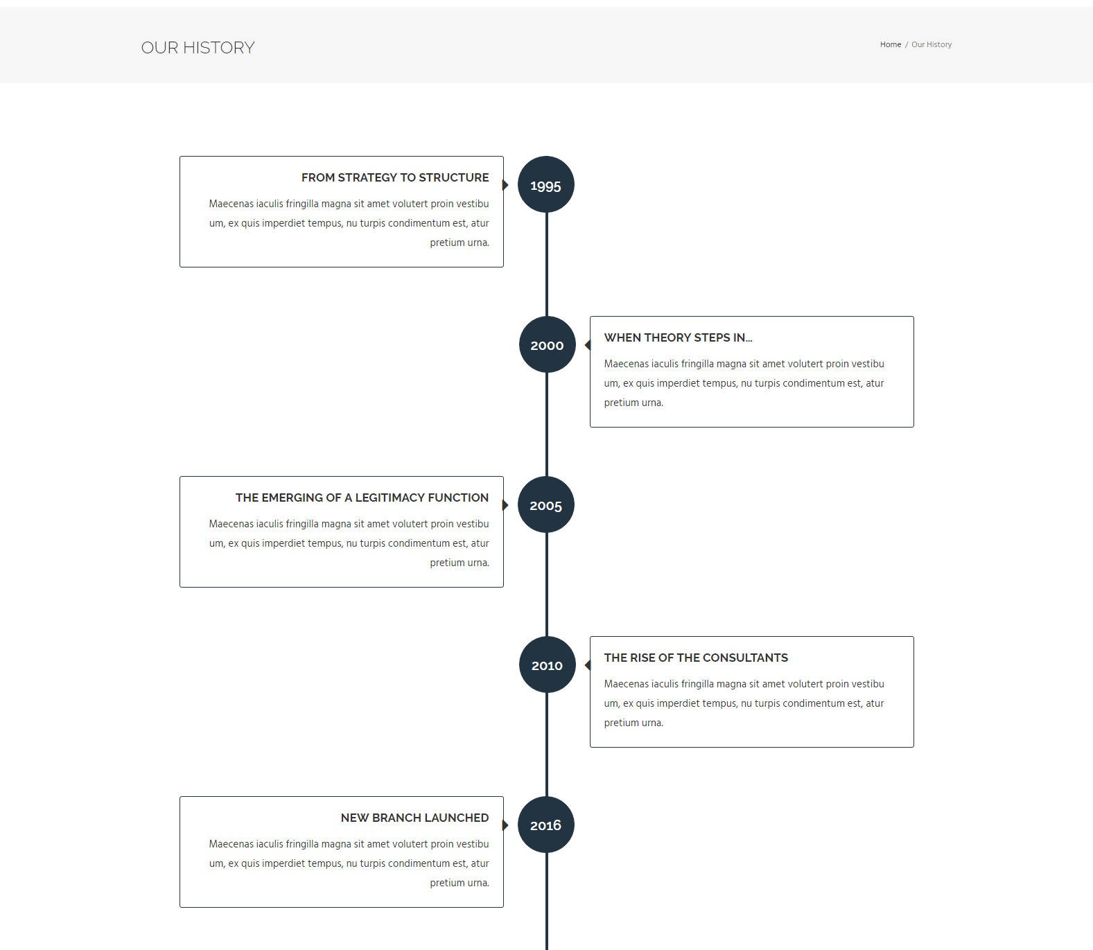 [vc_row parallax="content-moving" parallax_image="315" center_row="yes" typo_style="light" css=".vc_custom_1471501389453{padding-bottom: 85px !important;}" el_id="section-timeline"][vc_column][vc_row_inner css=".vc_custom_1471496104412{padding-top: 30px !important;}"][vc_column_inner width="1/2" typo_style="dark" css=".vc_custom_1471496358688{padding-top: 0px !important;}"][zozo_vc_timeline timeline_align="right" timeline_text="1995" title="From strategy to structure" title_type="h5" title_transform="uppercase" title_weight="700"]Maecenas iaculis fringilla magna sit amet volutert proin vestibu um, ex quis imperdiet tempus, nu turpis condimentum est, atur pretium urna.[/zozo_vc_timeline][/vc_column_inner][vc_column_inner width="1/2" typo_style="dark"][/vc_column_inner][/vc_row_inner][vc_row_inner css=".vc_custom_1473337656742{padding-top: 0px !important;}"][vc_column_inner width="1/2"][/vc_column_inner][vc_column_inner width="1/2" typo_style="dark"][zozo_vc_timeline timeline_text="2000" title="When theory steps in…" title_type="h5" title_transform="uppercase" title_weight="700"]Maecenas iaculis fringilla magna sit amet volutert proin vestibu um, ex quis imperdiet tempus, nu turpis condimentum est, atur pretium urna.[/zozo_vc_timeline][/vc_column_inner][/vc_row_inner][vc_row_inner css=".vc_custom_1473337672186{padding-top: 0px !important;}"][vc_column_inner width="1/2" typo_style="dark" css=".vc_custom_1471495317165{padding-top: 0px !important;}"][zozo_vc_timeline timeline_align="right" timeline_text="2005" title="The emerging of a legitimacy function" title_type="h5" title_transform="uppercase" title_weight="700"]Maecenas iaculis fringilla magna sit amet volutert proin vestibu um, ex quis imperdiet tempus, nu turpis condimentum est, atur pretium urna.[/zozo_vc_timeline][/vc_column_inner][vc_column_inner width="1/2" typo_style="dark"][/vc_column_inner][/vc_row_inner][vc_row_inner css=".vc_custom_1473337690087{padding-top: 0px !important;}"][vc_column_inner width="1/2"][/vc_column_inner][vc_column_inner width="1/2" typo_style="dark"][zozo_vc_timeline timeline_text="2010" title="The rise of the consultants" title_type="h5" title_transform="uppercase" title_weight="700"]Maecenas iaculis fringilla magna sit amet volutert proin vestibu um, ex quis imperdiet tempus, nu turpis condimentum est, atur pretium urna.[/zozo_vc_timeline][/vc_column_inner][/vc_row_inner][vc_row_inner css=".vc_custom_1473337672186{padding-top: 0px !important;}"][vc_column_inner width="1/2" typo_style="dark" css=".vc_custom_1471495317165{padding-top: 0px !important;}"][zozo_vc_timeline timeline_align="right" timeline_text="2016" title="New Branch Launched" title_type="h5" title_transform="uppercase" title_weight="700"]Maecenas iaculis fringilla magna sit amet volutert proin vestibu um, ex quis imperdiet tempus, nu turpis condimentum est, atur pretium urna.[/zozo_vc_timeline][/vc_column_inner][vc_column_inner width="1/2" typo_style="dark"][/vc_column_inner][/vc_row_inner][/vc_column][/vc_row]