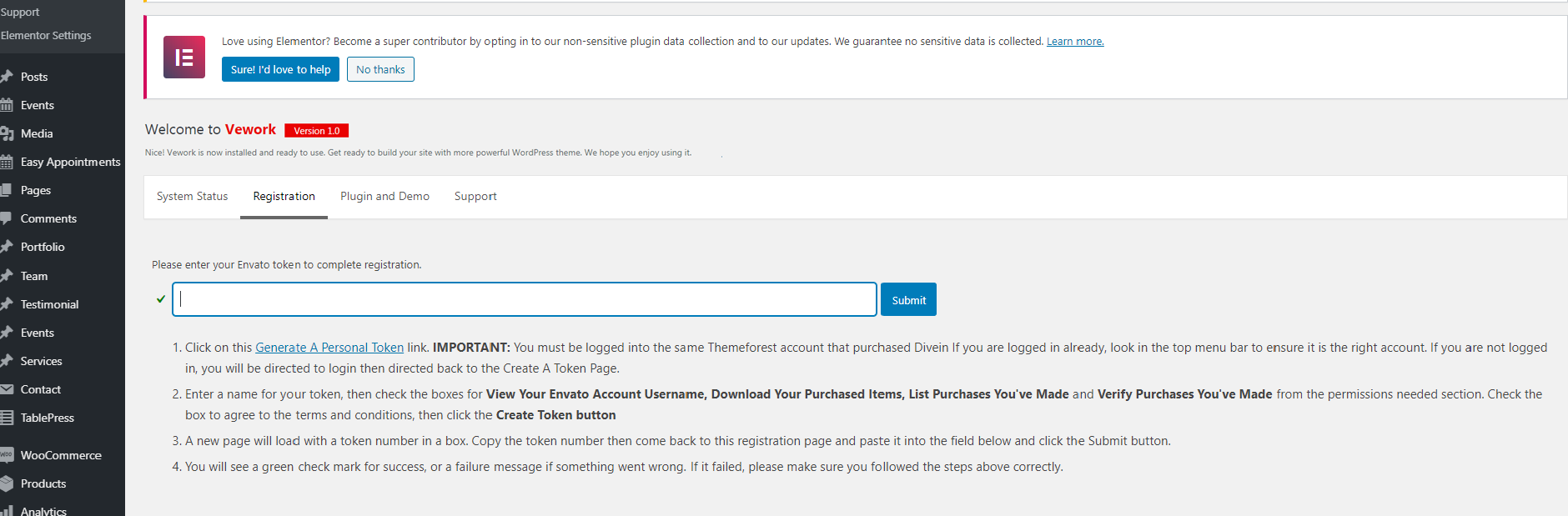 In order to import the demo content go to Theme Panel (WP Dashboard) > Vework > plugin and Demo.