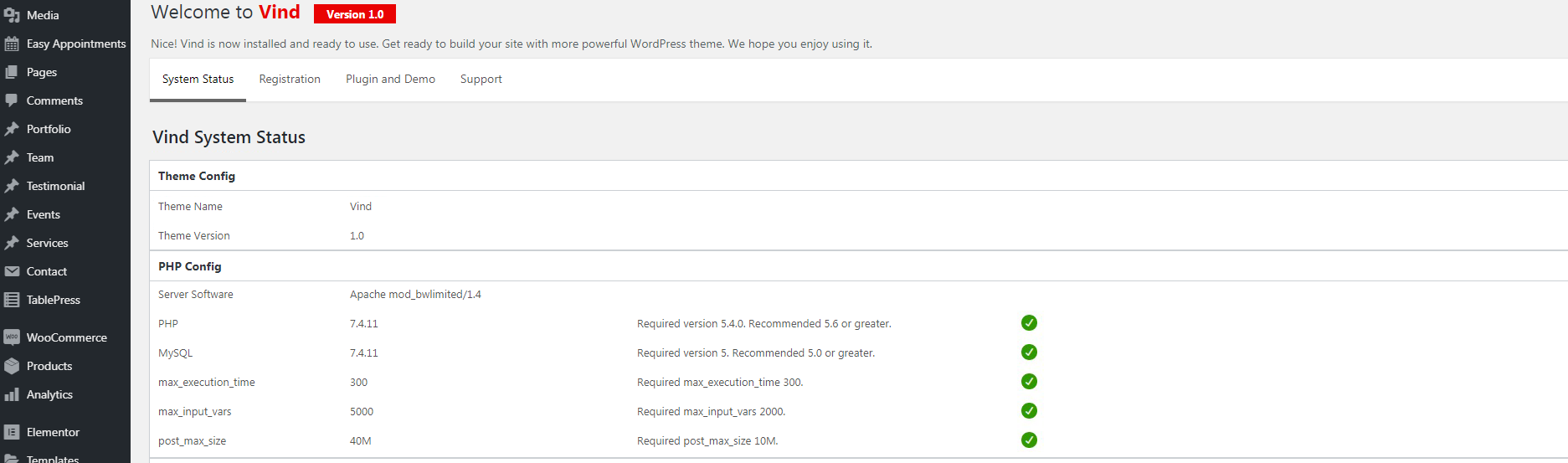 - After the installation/activation of Vind Core plug-in and the theme activation you will see plug-ins to install tab. Click on the Click and install plugins link or go to Wordpress Dashboard >> Vind >> plugins and demo here you can install all of our recommended plugins.