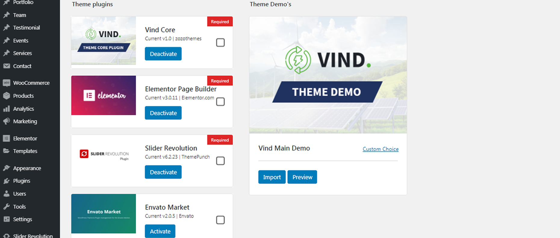 In order to import the demo content go to Theme Panel (WP Dashboard) > Vind > plugin and Demo.