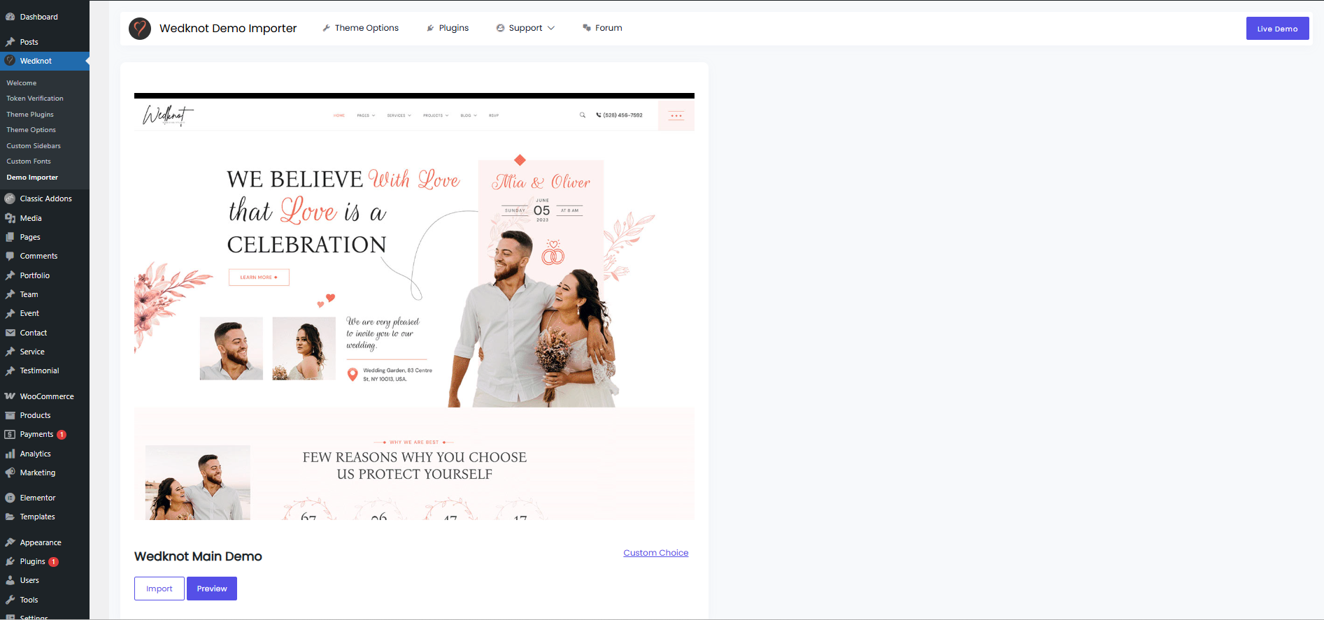 To import the demo go to Theme Panel (WP Dashboard) > Wedknot > Demo Importer.